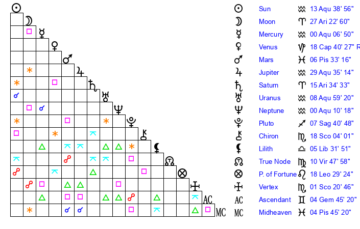 | Sun | 13 Aquarius 39 | 14 Aquarius 6 | 10 Pisces 54 |