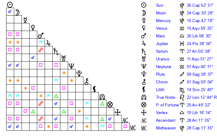 Sun | 26 Capricorn 53 | 27 Capricorn 35 | 23 Aquarius 17 |