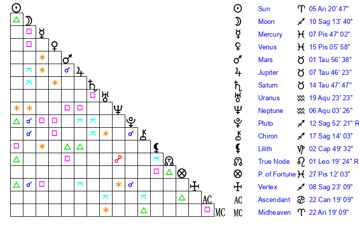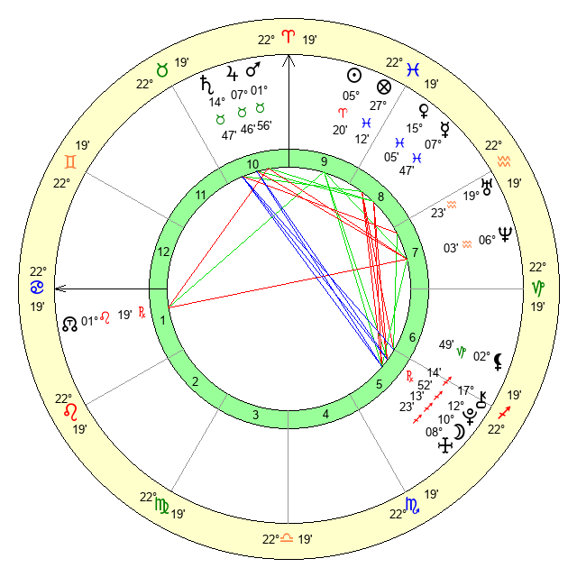 Sun | 5 Aries 21 | 5 Aries 18 | 29 Aries 56 |