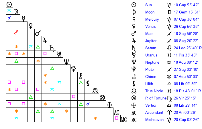 | Moon | 17 Gemini 19 | 3 Aquarius 26 | 6 Aquarius 12 |