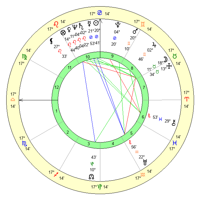 | Mercury | 21 Cancer 54 | 14 Leo 46 | 2 Scorpio 28 |