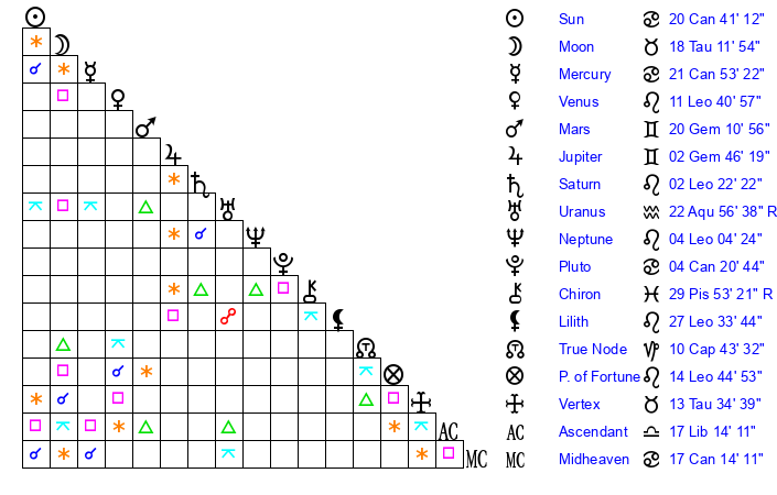| Uranus | 22 Aquarius 53 | 0 Gemini 17 | 19 Aquarius 44 |