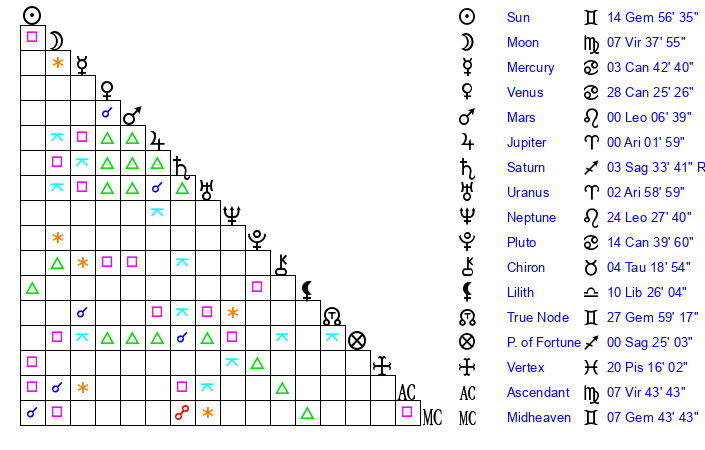 | Sun | 14 Gemini 56 | 16 Gemini 12 | 18 Virgo 53 |