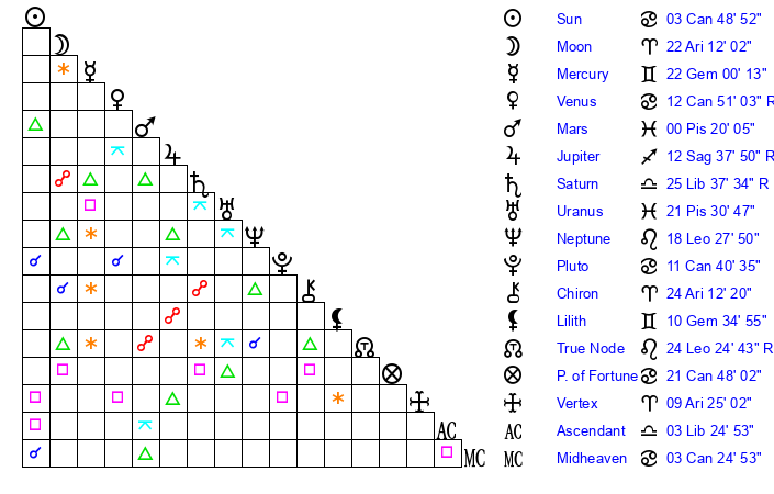 | Moon | 22 Aries 13 | 8 Cancer 1 | 29 Sagittarius 16 |