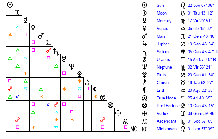 Moon | 1 Taurus 7 | 16 Taurus 15 | 3 Scorpio 41 |