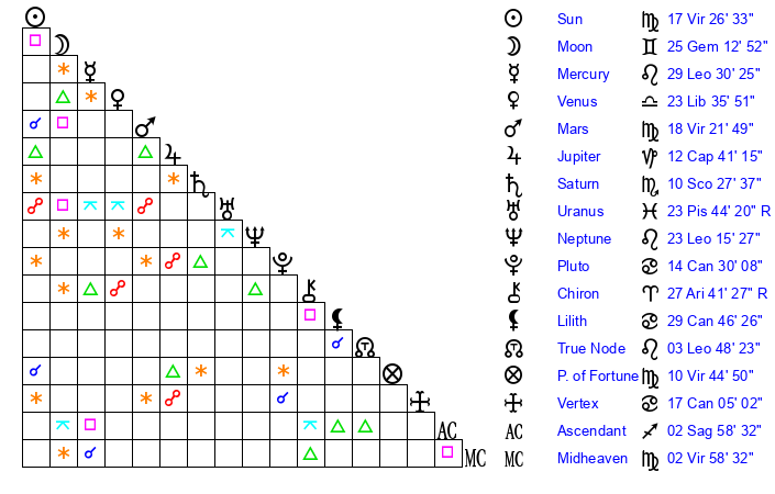 | Sun | 17 Virgo 27 | 18 Virgo 14 | 27 Sagittarius 18 |