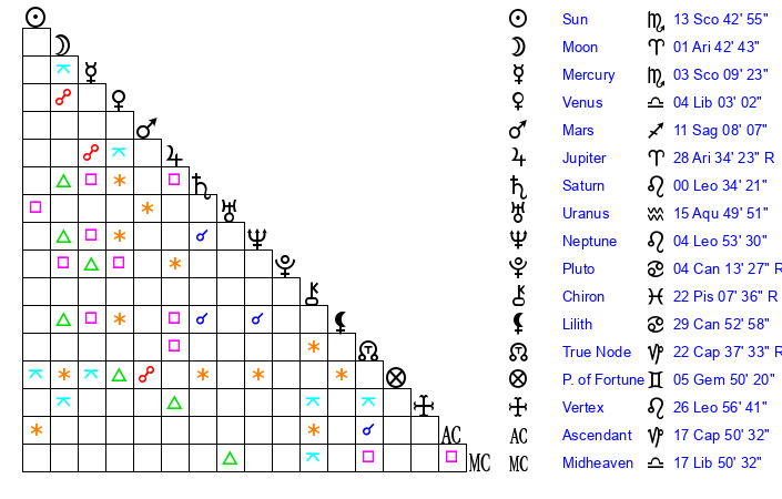 | Sun | 13 Scorpio 42 | 14 Scorpio 17 | 4 Pisces 16 |