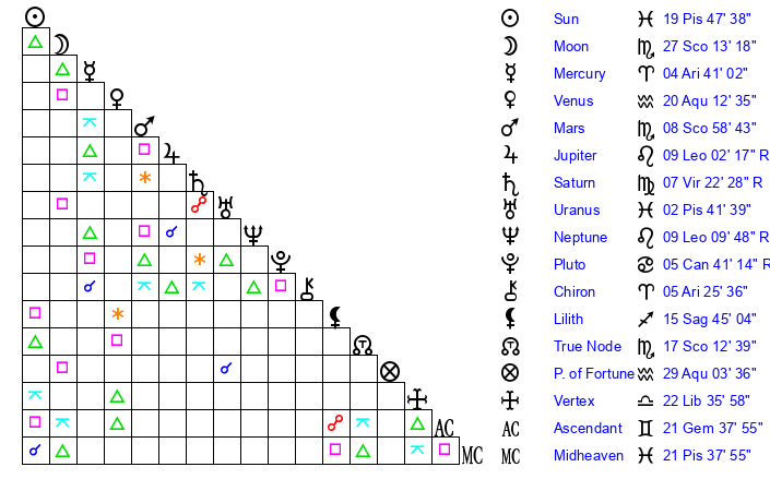 | Saturn | 8 Virgo 9 | 21 Pisces 48 | 7 Virgo 23 |