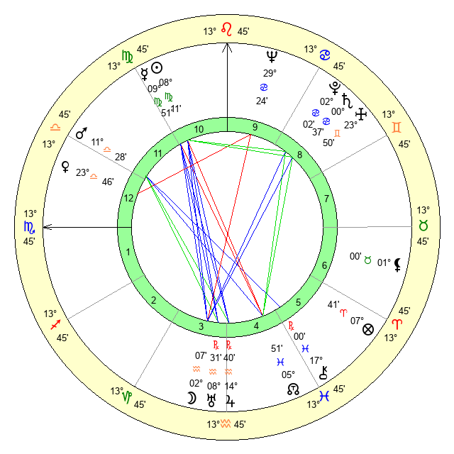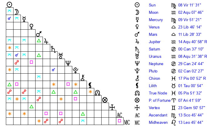| Sun | 8 Virgo 11 | 9 Virgo 18 | 28 Sagittarius 47 |