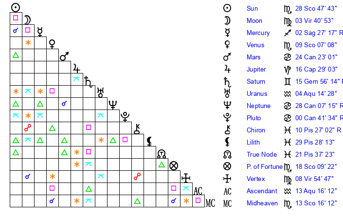 | Moon | 3 Virgo 39 | 15 Sagittarius 11 | 13 Libra 51 |