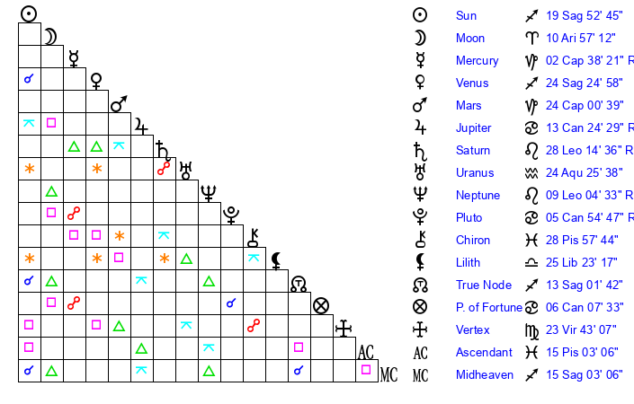 | Sun | 19 Sagittarius 52 | 21 Sagittarius 10 | 6 Aries 58 |