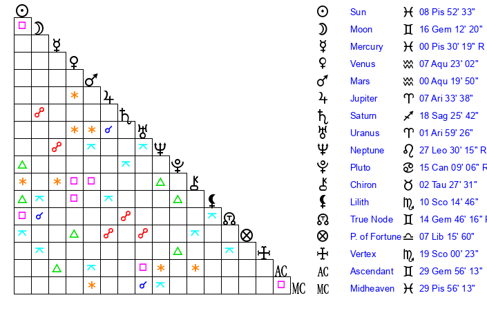 | Moon | 16 Gemini 16 | 19 Pisces 32 | 27 Sagittarius 3 |