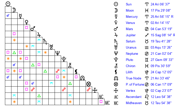 Sun | 24 Aries 6 | 24 Aries 44 | 12 Leo 36 |