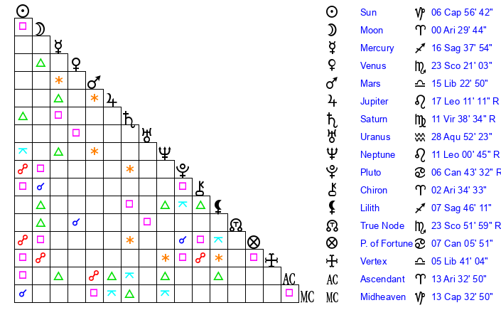 | Sun | 6 Capricorn 56 | 8 Capricorn 29 | 22 Aries 28 |
