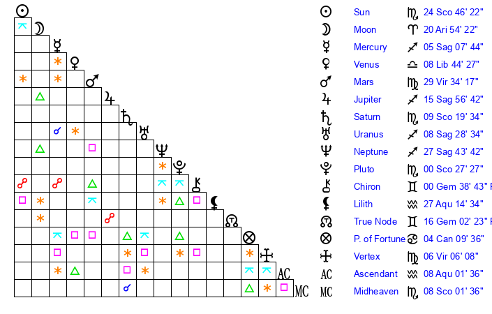 | Moon | 20 Aries 55 | 27 Libra 34 | 14 Scorpio 12 |