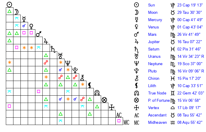 | Uranus | 14 Virgo 38 | 23 Taurus 24 | 12 Virgo 23 |