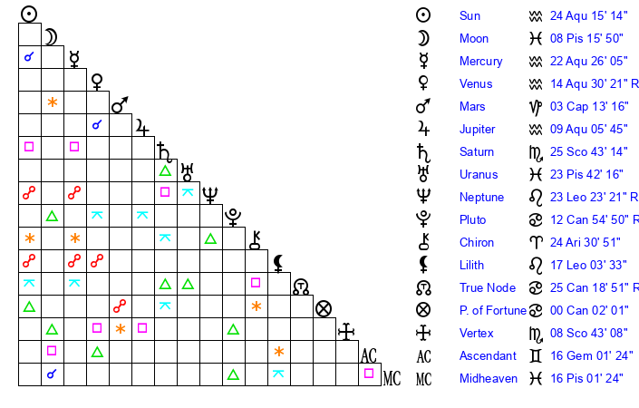 | Sun | 24 Aquarius 15 | 25 Aquarius 15 | 1 Gemini 47 |
