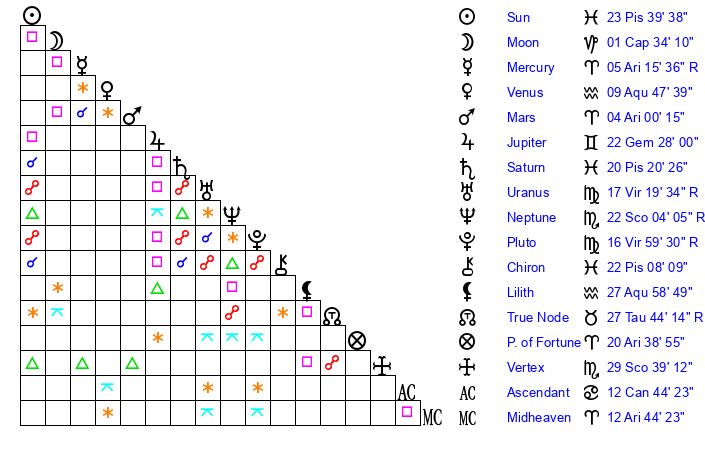 Moon | 1 Capricorn 31 | 28 Virgo 52 | 24 Aquarius 0 |