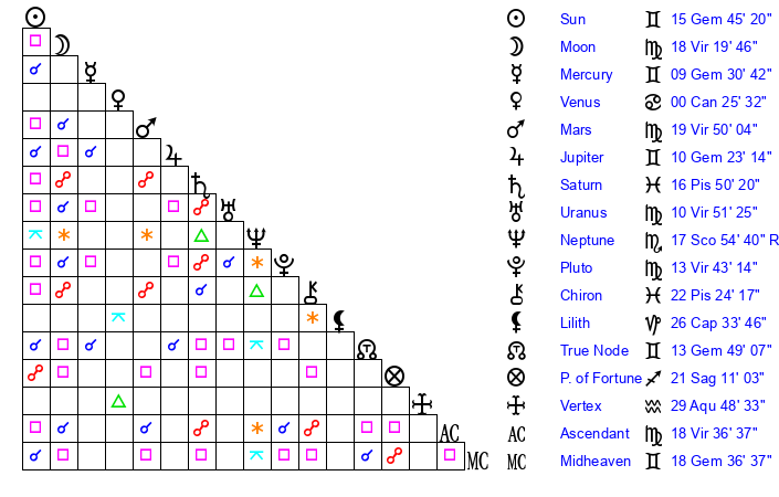 | Neptune | 17 Scorpio 54 | 1 Aries 57 | 17 Scorpio 14 |
