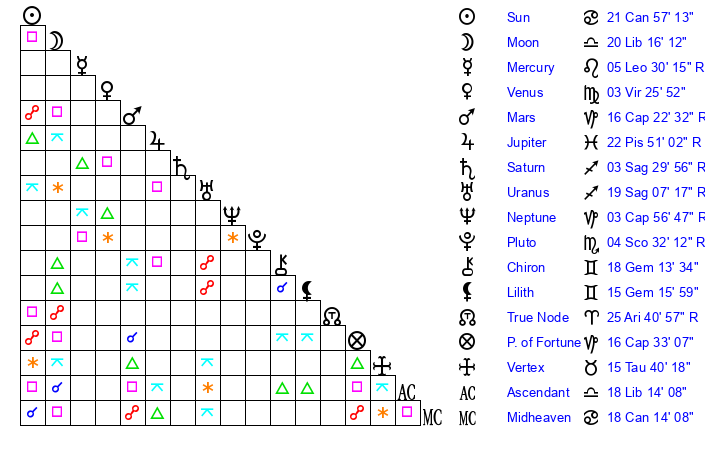| Neptune | 3 Capricorn 56 | 2 Aries 8 | 3 Capricorn 10 |