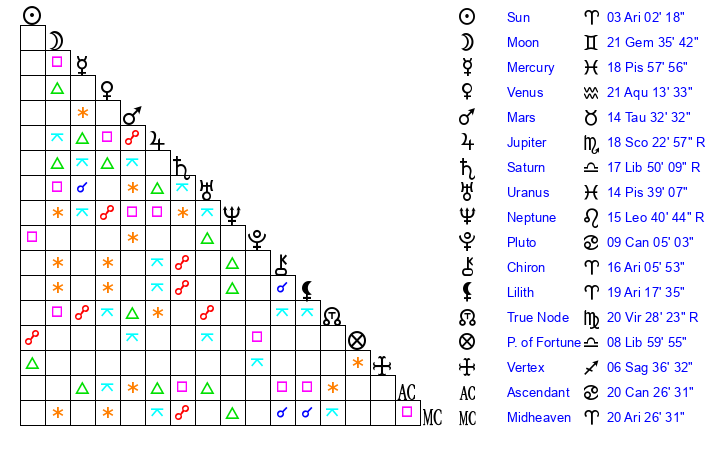 | Moon | 21 Gemini 29 | 0 Aquarius 46 | 26 Pisces 35 |