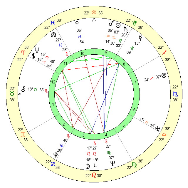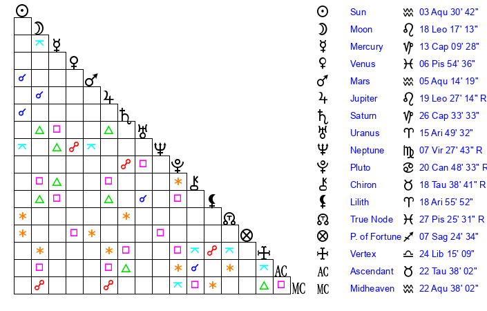 | Neptune | 7 Virgo 27 | 27 Pisces 46 | 5 Virgo 18 |