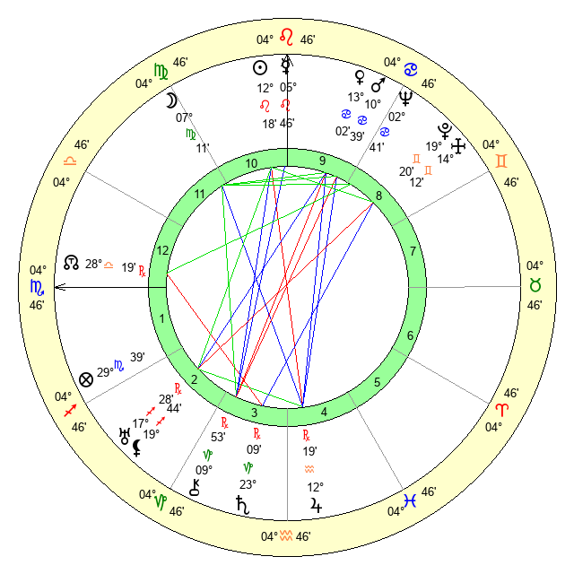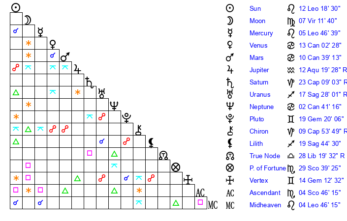 | Moon | 7 Virgo 12 | 29 Sagittarius 56 | 25 Aquarius 56 |