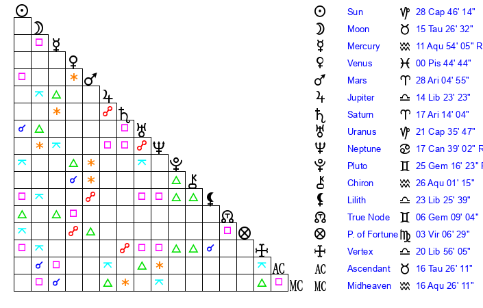 | Sun | 28 Capricorn 46 | 29 Capricorn 52 | 23 Taurus 0 |