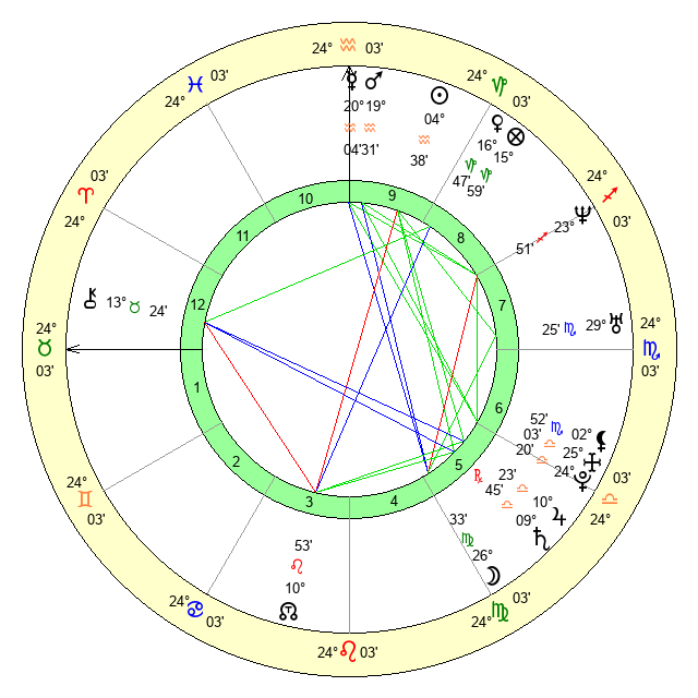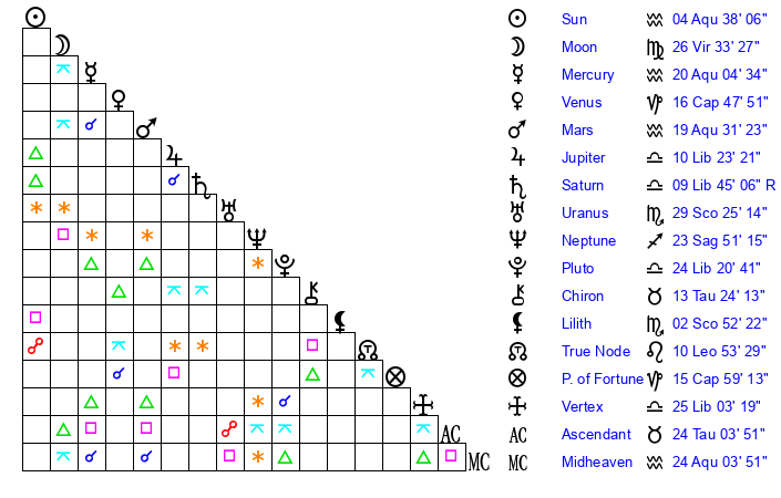 | Moon | 26 Virgo 30 | 6 Sagittarius 16 | 4 Taurus 0 |