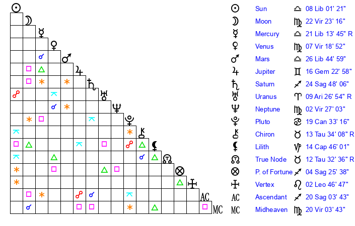 | Moon | 22 Virgo 18 | 28 Capricorn 27 | 17 Pisces 2 |
