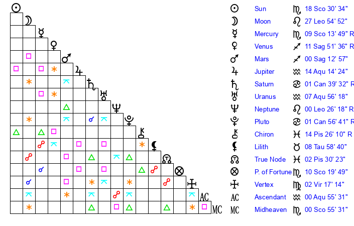 | Moon | 27 Leo 54 | 22 Pisces 35 | 9 Virgo 48 |