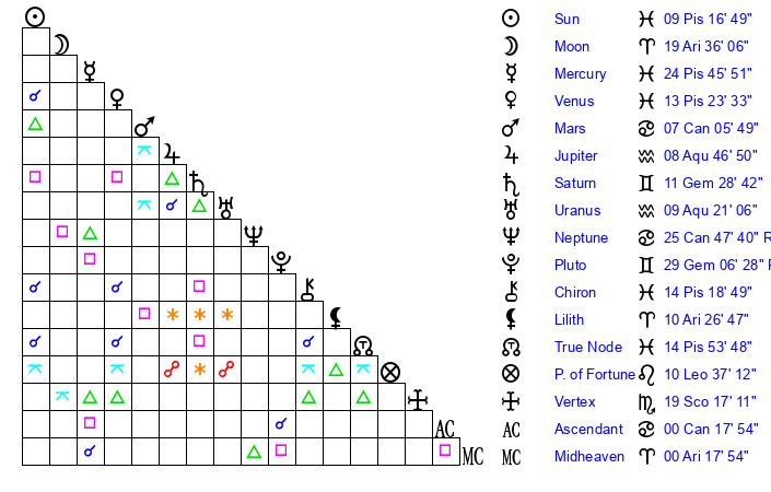 | Moon | 19 Aries 32 | 19 Pisces 32 | 12 Taurus 21 |