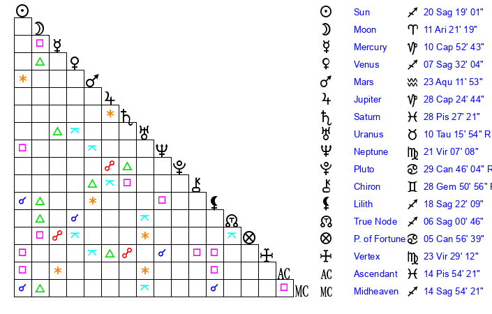 | Sun | 20 Sagittarius 19 | 20 Sagittarius 58 | 19 Pisces 30 |