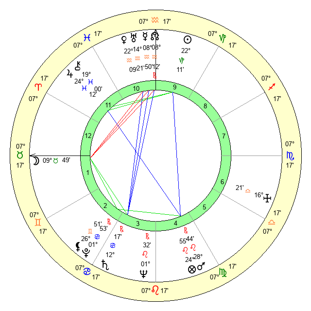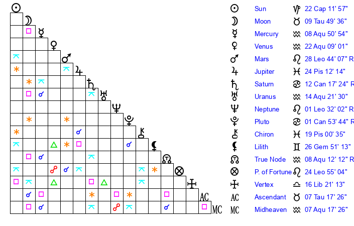 | Venus | 22 Aquarius 9 | 10 Pisces 53 | 26 Gemini 18 |