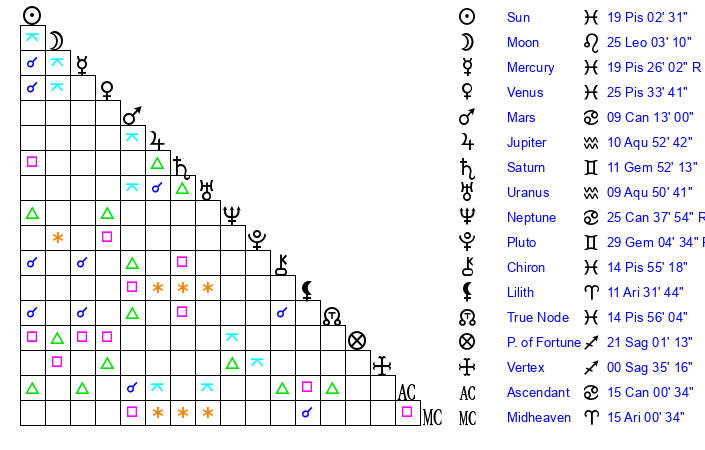 | Sun | 19 Pisces 2 | 20 Pisces 7 | 6 Cancer 50 |