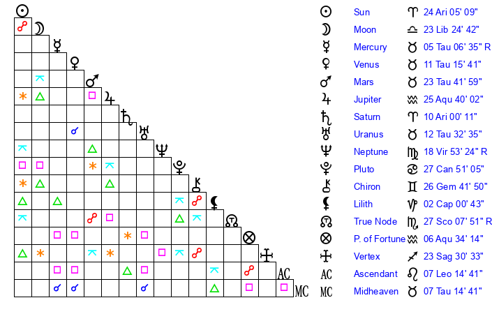 | Venus | 11 Taurus 16 | 24 Pisces 42 | 25 Leo 54 |