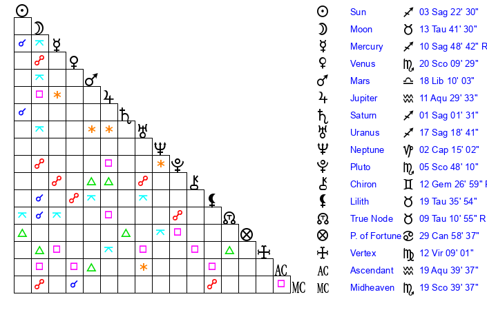 | Saturn | 1 Sagittarius 16 | 25 Pisces 4 | 5 Sagittarius 46 |