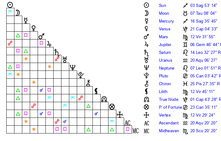 | Sun | 3 Sagittarius 53 | 4 Sagittarius 56 | 22 Pisces 19 |