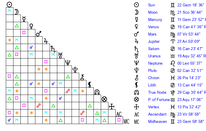 | Sun | 22 Gemini 18 | 22 Gemini 56 | 7 Libra 11 |