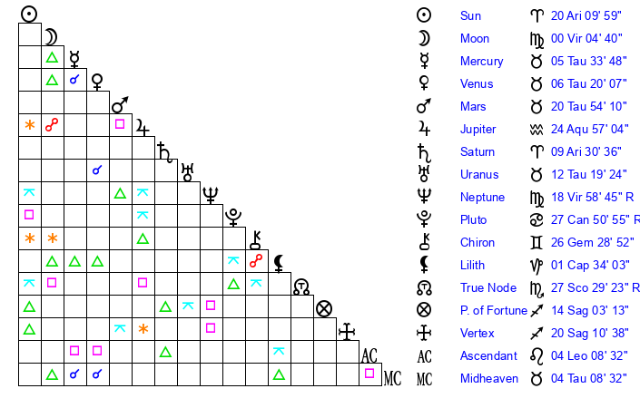 | Neptune | 18 Virgo 58 | 0 Aries 24 | 18 Virgo 43 |
