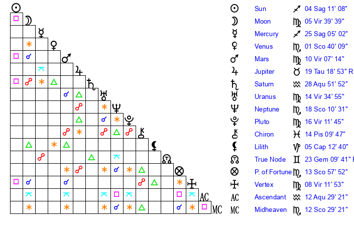 | Mars | 10 Virgo 7 | 15 Sagittarius 54 | 28 Virgo 0 |