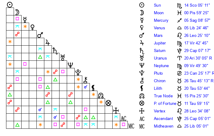 | Neptune | 9 Virgo 49 | 29 Pisces 40 | 9 Virgo 21 |