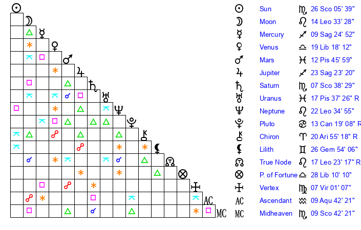 | Neptune | 22 Leo 34 | 27 Pisces 13 | 20 Leo 45 |
