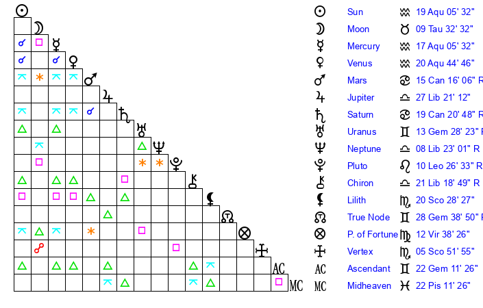 | Venus | 20 Aquarius 45 | 2 Aries 53 | 28 Taurus 47 |