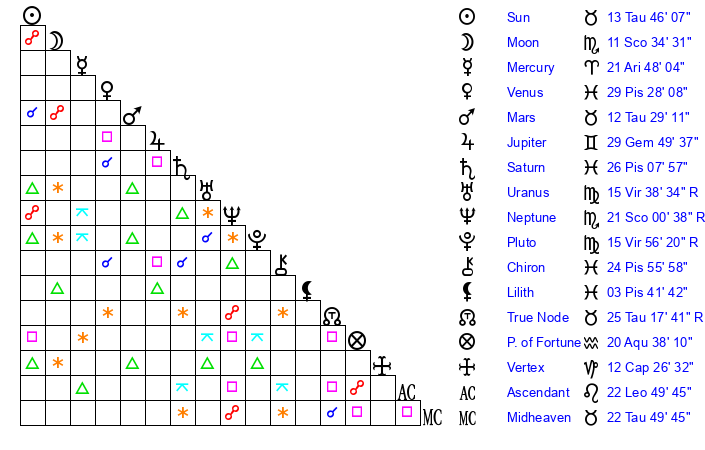 Mars | 12 Taurus 29 | 7 Leo 19 | 24 Gemini 17 |