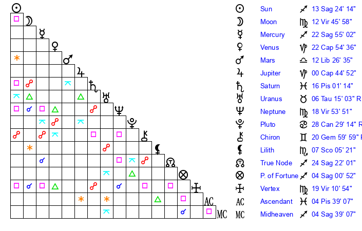 | Moon | 12 Virgo 49 | 24 Gemini 18 | 6 Sagittarius 12 |