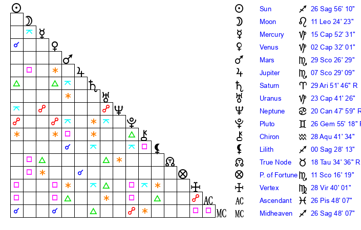 Pluto | 26 Gemini 55 | 0 Aquarius 42 | 26 Gemini 5 |