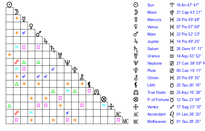 | Sun | 16 Aries 47 | 18 Aries 7 | 2 Leo 36 |