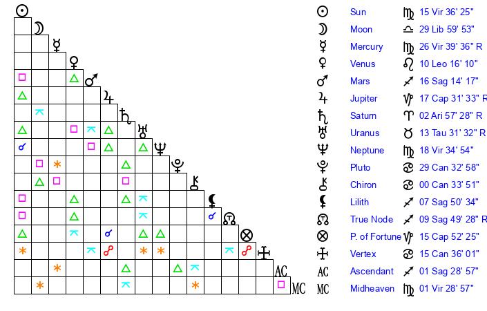 | Sun | 15 Virgo 36 | 16 Virgo 18 | 13 Sagittarius 9 |