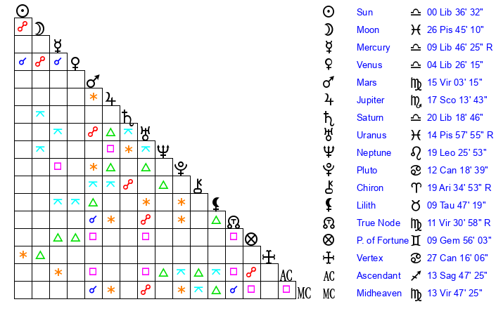 | Saturn | 20 Libra 53 | 28 Pisces 7 | 1 Scorpio 43 |